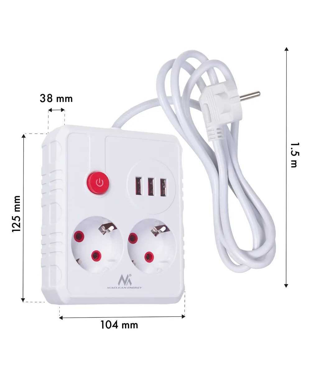 - Tehnične specifikacije: - Število vtičnic: 2 - Vrsta vtičnice: F (šuko) - Vrsta vtiča: unischuko (univerzalni) - Število USB vrat: 3 USB vrata tipa A (2,1 A, 5 V DC) - Največja obremenitev: 2500 W - Napetost: 110–240 V AC - Dolžina kabla: 1,5 m - Specifikacija kabla: 3x0,75m2, 227 IEC 53 (RVV), 300/500V - Položaj vtičnice: kot 45° - Stikalo: rdeč gumb z vijolično osvetlitvijo - Material ohišja: plastika - Dimenzije ohišja: 125 x 103 x 38 mm - Razmik med montažnimi luknjami: 85 mm - Barva: bela - Garancija 12 mesecev - Varnostna slika izdelka- Info proizvajalca / Odgovorna oseba EU - Euroelectronics.eu Sp. z o. k., Korfantego 7, 42-600, Poland, sklep@centrumelektroniki.pl