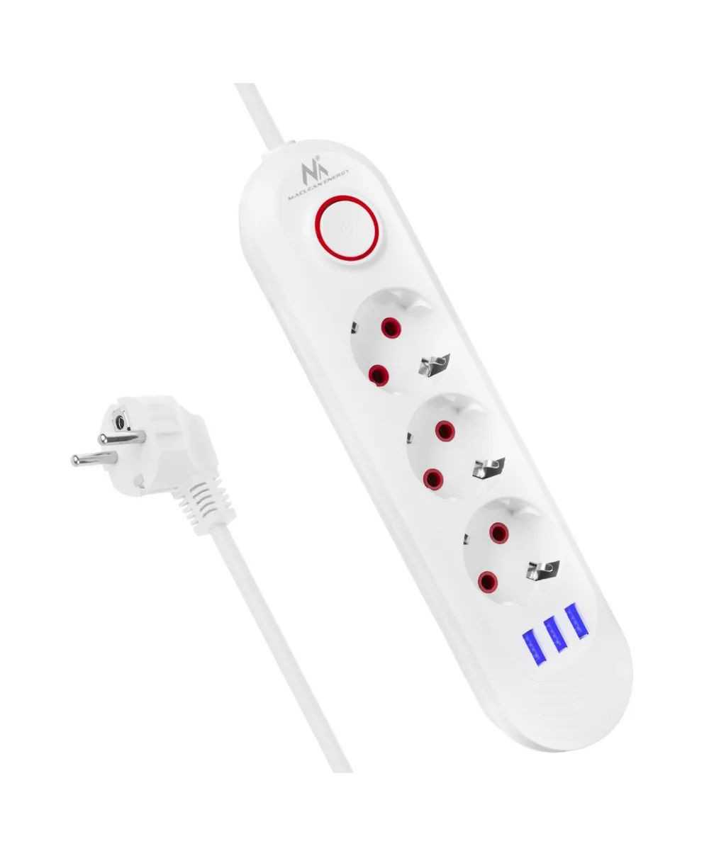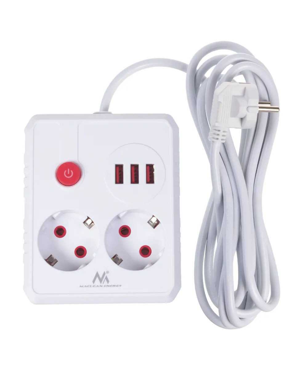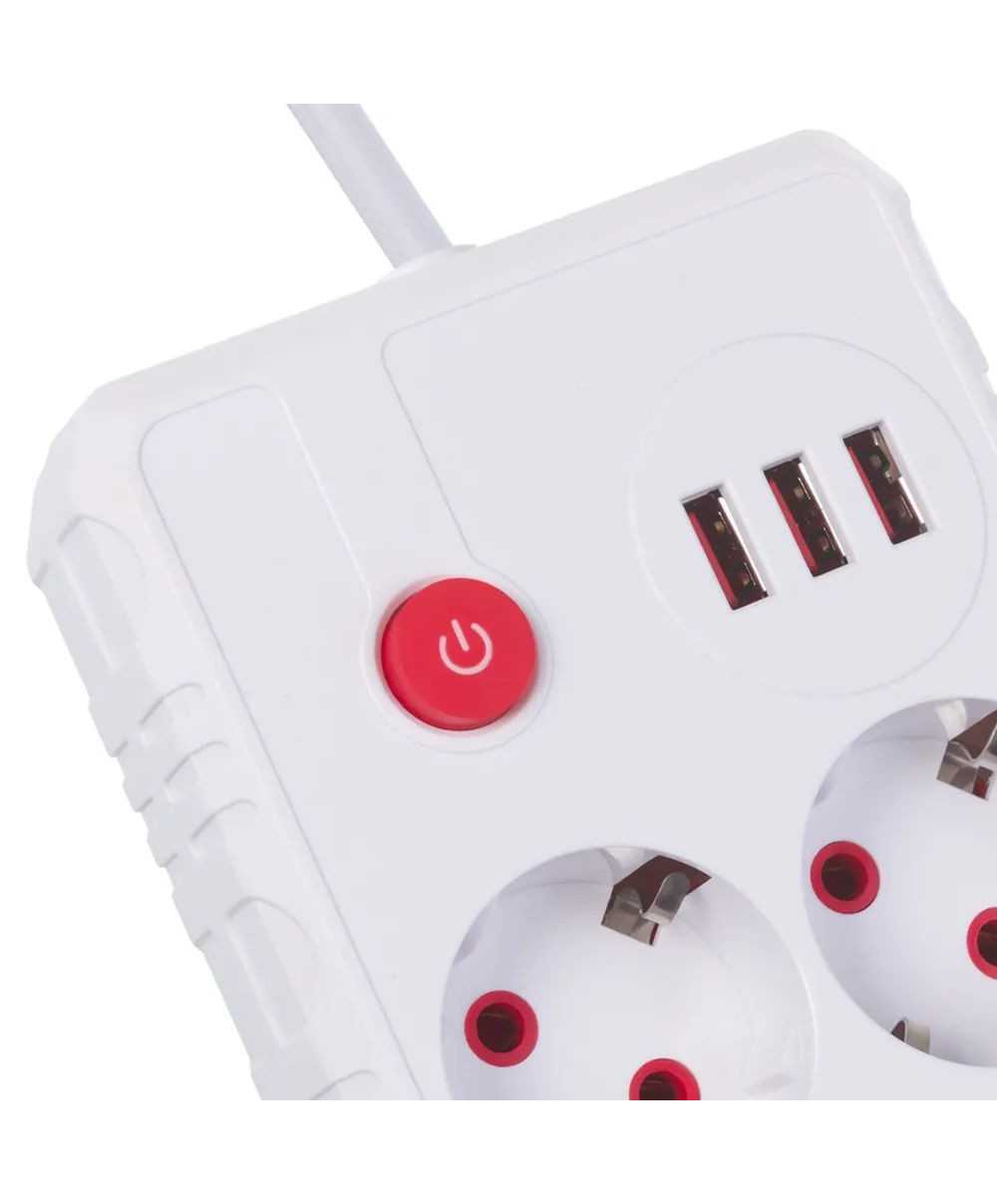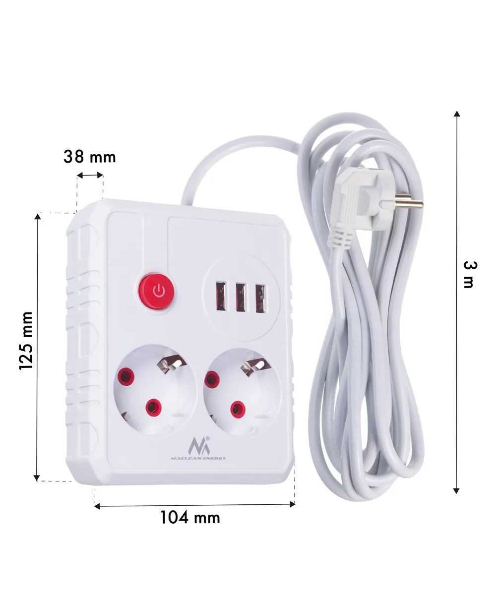 - Tehnične specifikacije: - Število vtičnic: 2 - Vrsta vtičnice: F (šuko) - Vrsta vtiča: unischuko (univerzalni) - Število USB vrat: 3 USB vrata tipa A (2,1 A, 5 V DC) - Največja obremenitev: 2500 W - Napetost: 110–240 V AC - Dolžina kabla: 3 m - Specifikacija kabla: 3x0,75m2, 227 IEC 53 (RVV), 300/500V - Položaj vtičnice: kot 45° - Stikalo: rdeč gumb z vijolično osvetlitvijo - Material ohišja: plastika - Dimenzije ohišja: 125 x 103 x 38 mm - Razmik med montažnimi luknjami: 85 mm - Barva: bela - Garancija 12 mesecev - Varnostna slika izdelka- Info proizvajalca / Odgovorna oseba EU - Euroelectronics.eu Sp. z o. k., Korfantego 7, 42-600, Poland, sklep@centrumelektroniki.pl
