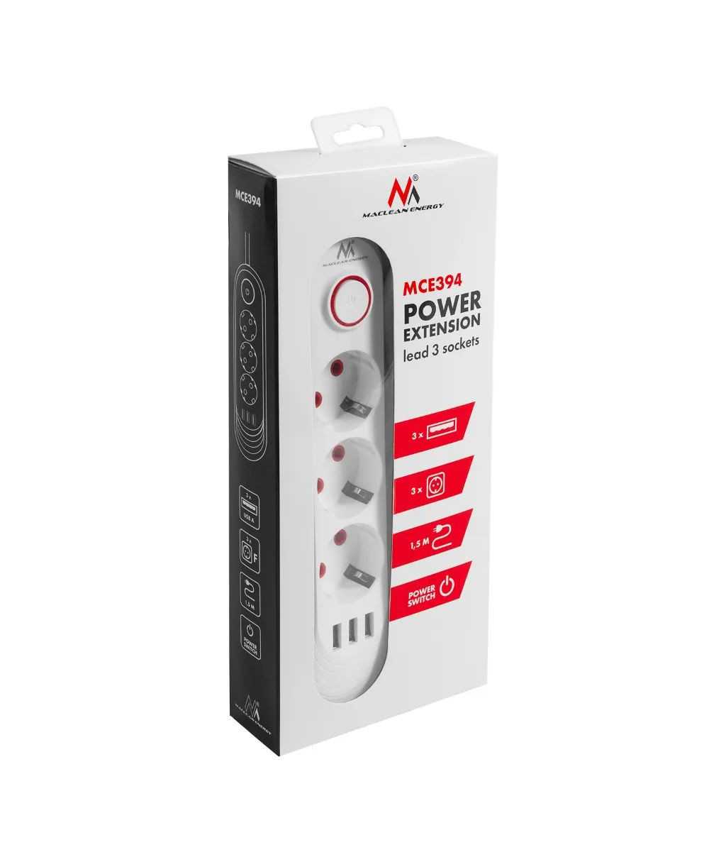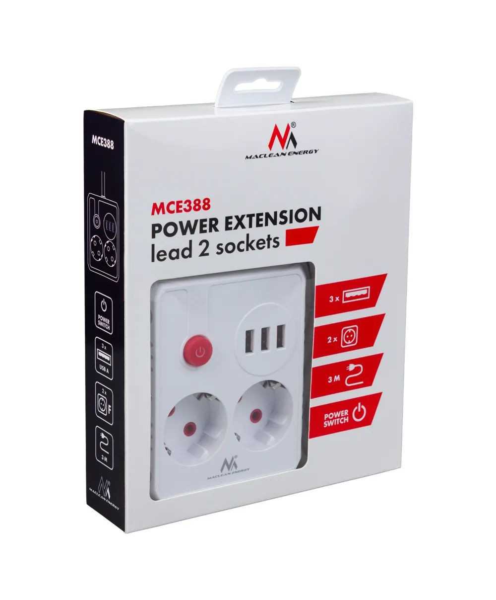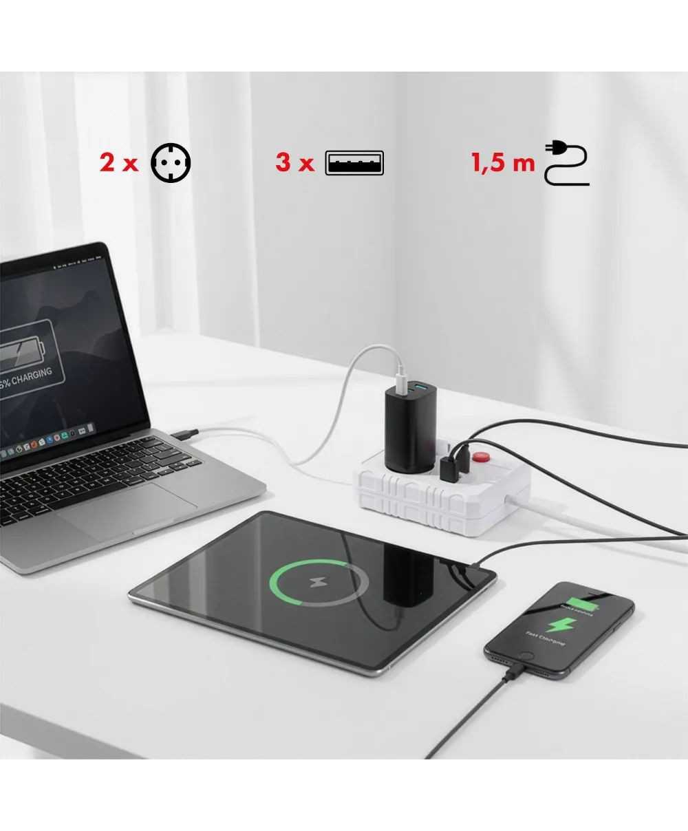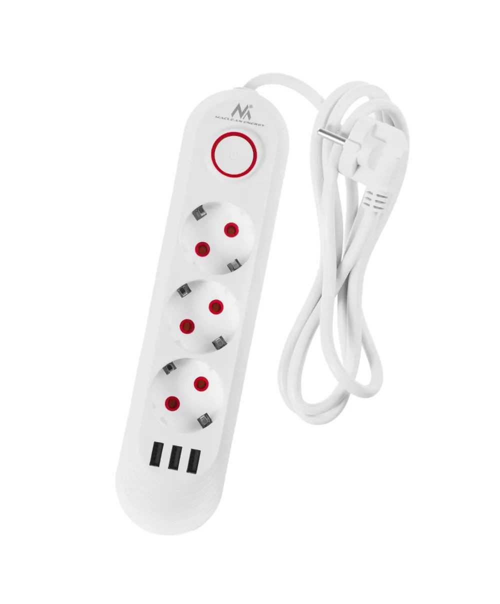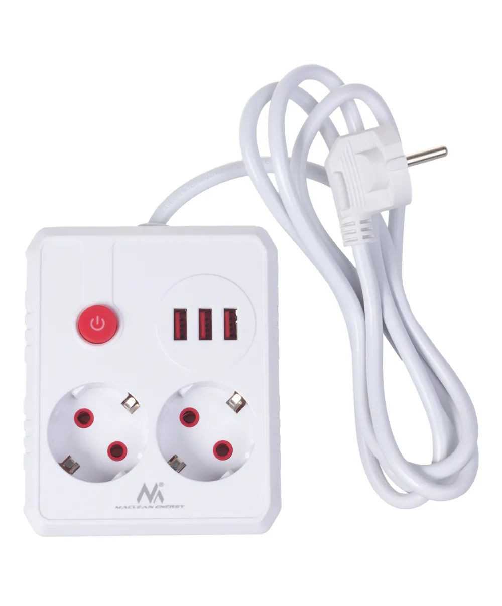 - Tehnične specifikacije: - Število vtičnic: 2 - Vrsta vtičnice: F (šuko) - Vrsta vtiča: unischuko (univerzalni) - Število USB vrat: 3 USB vrata tipa A (2,1 A, 5 V DC) - Največja obremenitev: 2500 W - Napetost: 110–240 V AC - Dolžina kabla: 3 m - Specifikacija kabla: 3x0,75m2, 227 IEC 53 (RVV), 300/500V - Položaj vtičnice: kot 45° - Stikalo: rdeč gumb z vijolično osvetlitvijo - Material ohišja: plastika - Dimenzije ohišja: 125 x 103 x 38 mm - Razmik med montažnimi luknjami: 85 mm - Barva: bela - Garancija 12 mesecev - Varnostna slika izdelka- Info proizvajalca / Odgovorna oseba EU - Euroelectronics.eu Sp. z o. k., Korfantego 7, 42-600, Poland, sklep@centrumelektroniki.pl