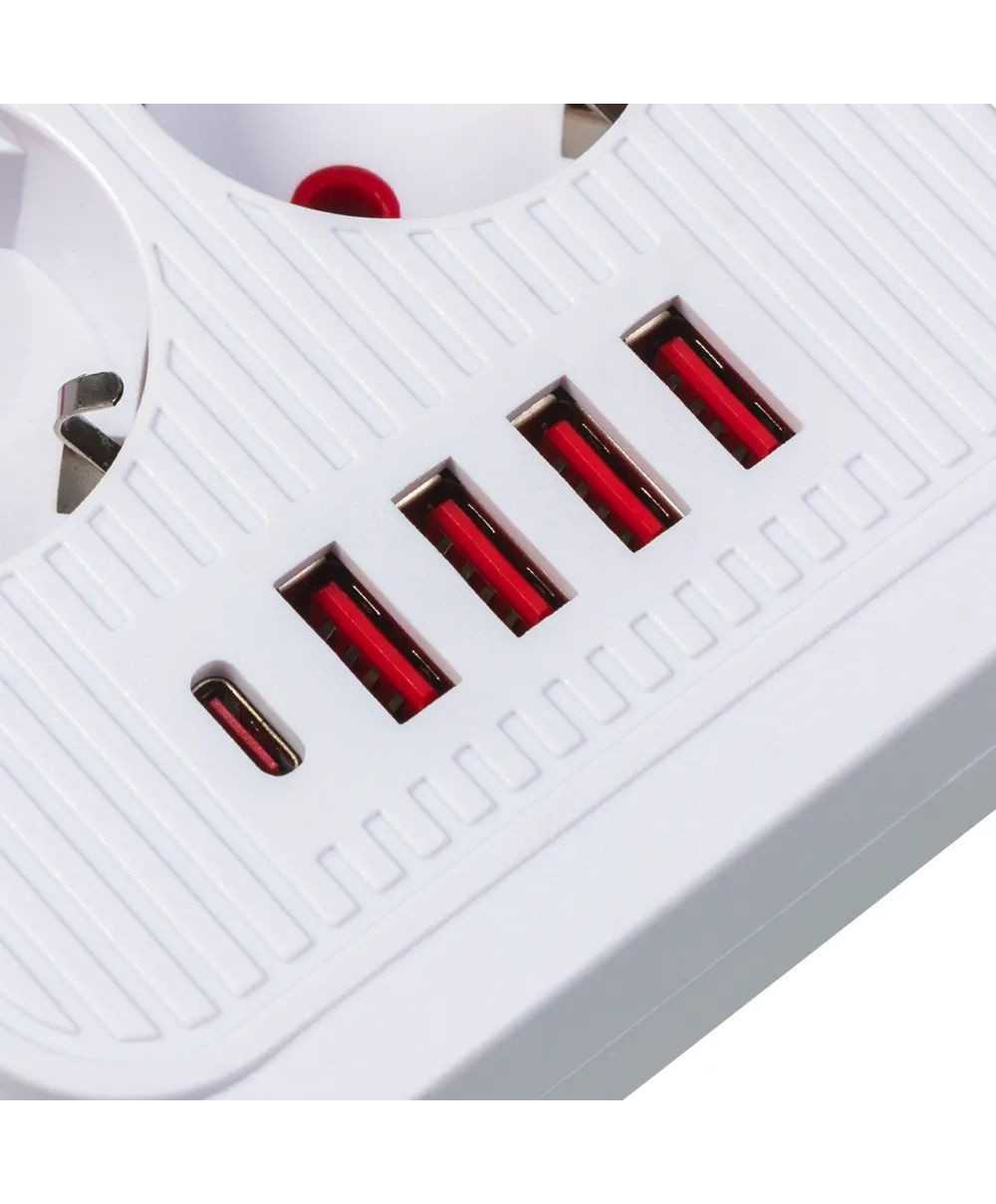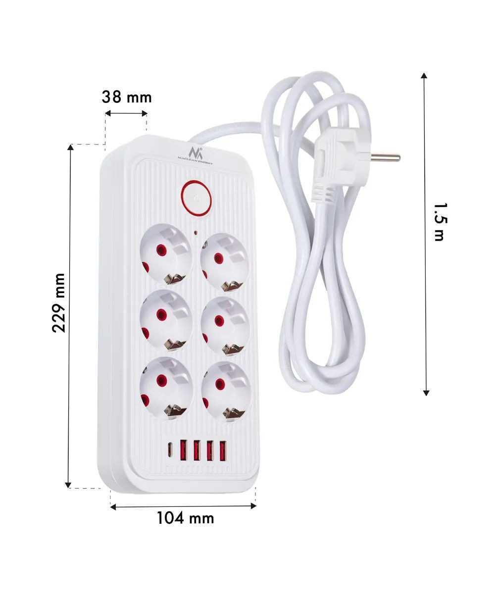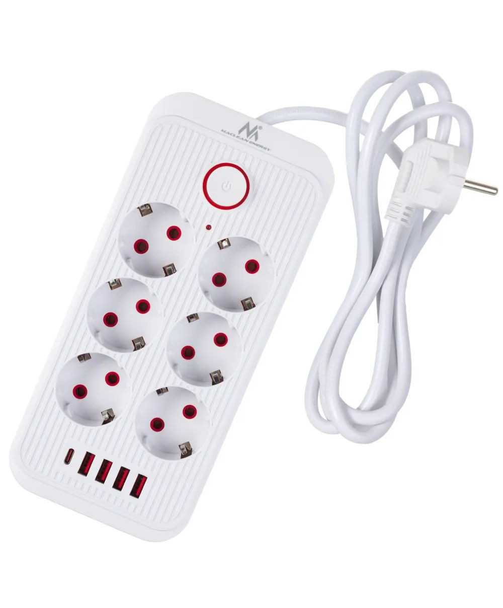 - Tehnične specifikacije: - Število vtičnic: 6 - Vrsta vtiča: unischuko (univerzalni) - Število vrat USB-A: 4 (2,1 A, 5 V enosmernega toka) - Število vrat USB-C: 1 - Največja obremenitev: 2500 W - Napetost: 110–240 V AC - Dolžina kabla: 1,5 m - Specifikacija kabla: 3x0,75m2, 227 IEC 53 (RVV), 300/500V - Položaj vtičnice: kot 45° - Stikalo: da - Indikatorska lučka: da - Material ohišja: plastika - Dimenzije ohišja: 229 x 104 x 38 mm - Razmik med montažnimi luknjami: 135 mm - Barva: bela - Garancija 12 mesecev - Varnostna slika izdelka- Info proizvajalca / Odgovorna oseba EU - Euroelectronics.eu Sp. z o. k., Korfantego 7, 42-600, Poland, sklep@centrumelektroniki.pl