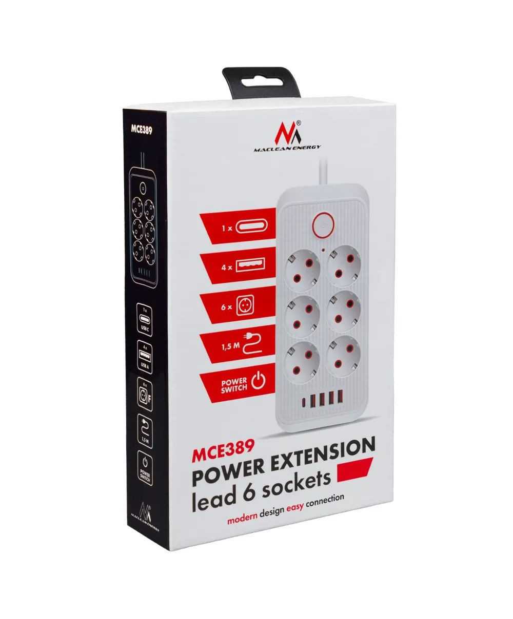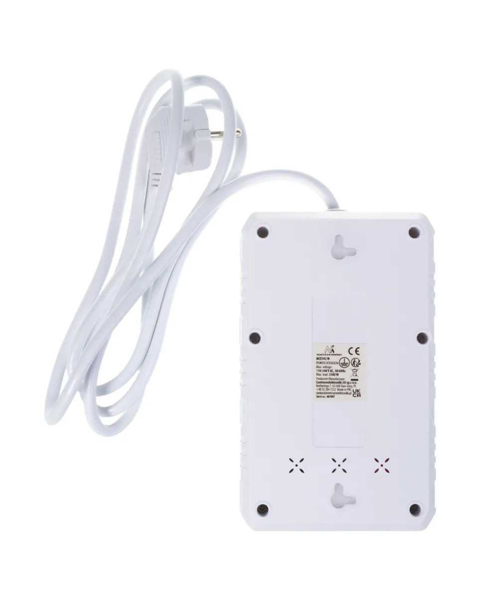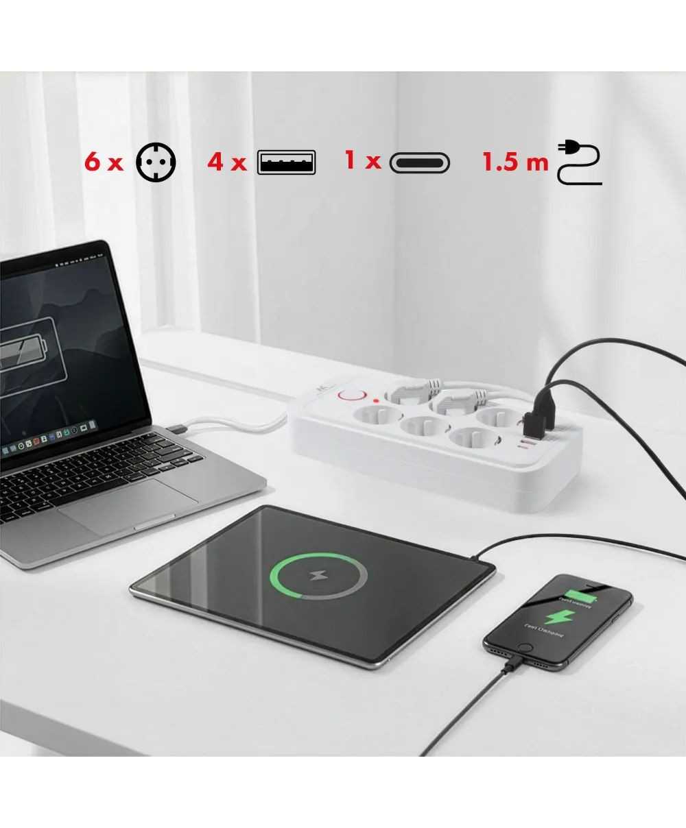 - Tehnične specifikacije: - Število vtičnic: 6 - Vrsta vtiča: unischuko (univerzalni) - Število vrat USB-A: 4 (2,1 A, 5 V enosmernega toka) - Število vrat USB-C: 1 - Največja obremenitev: 2500 W - Napetost: 110–240 V AC - Dolžina kabla: 1,5 m - Specifikacija kabla: 3x0,75m2, 227 IEC 53 (RVV), 300/500V - Položaj vtičnice: kot 45° - Stikalo: da - Indikatorska lučka: da - Material ohišja: plastika - Dimenzije ohišja: 229 x 104 x 38 mm - Razmik med montažnimi luknjami: 135 mm - Barva: bela - Garancija 12 mesecev - Varnostna slika izdelka- Info proizvajalca / Odgovorna oseba EU - Euroelectronics.eu Sp. z o. k., Korfantego 7, 42-600, Poland, sklep@centrumelektroniki.pl