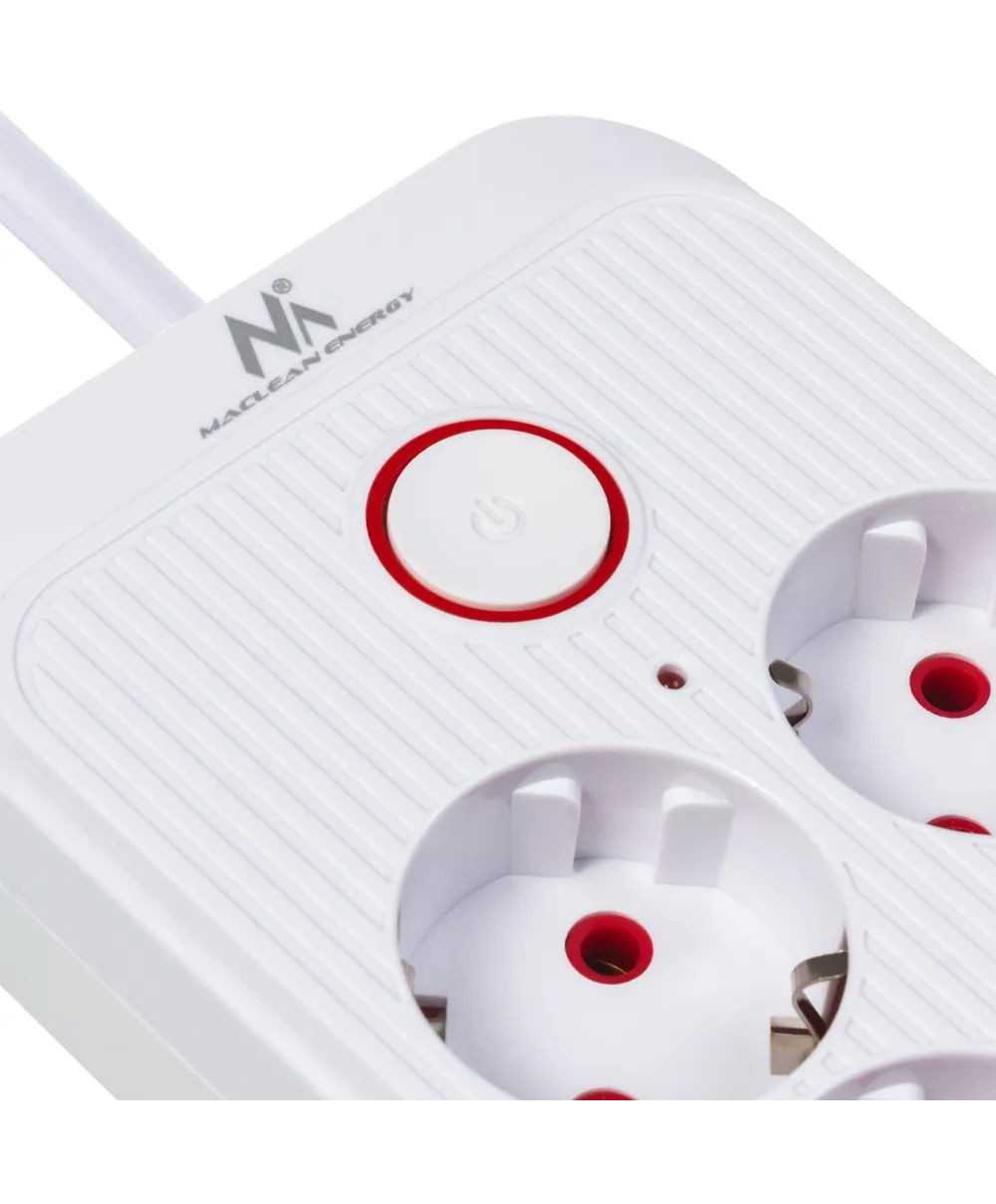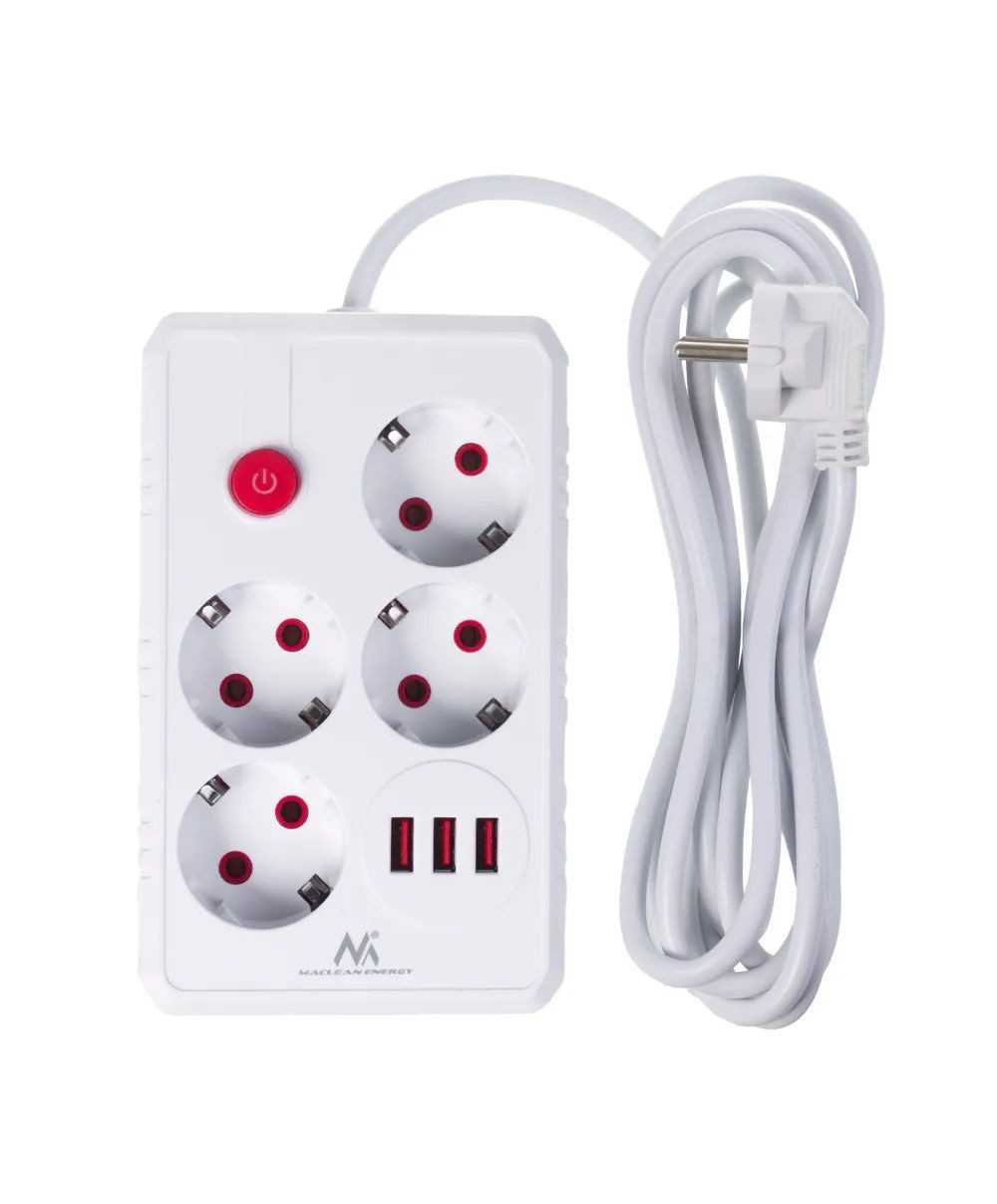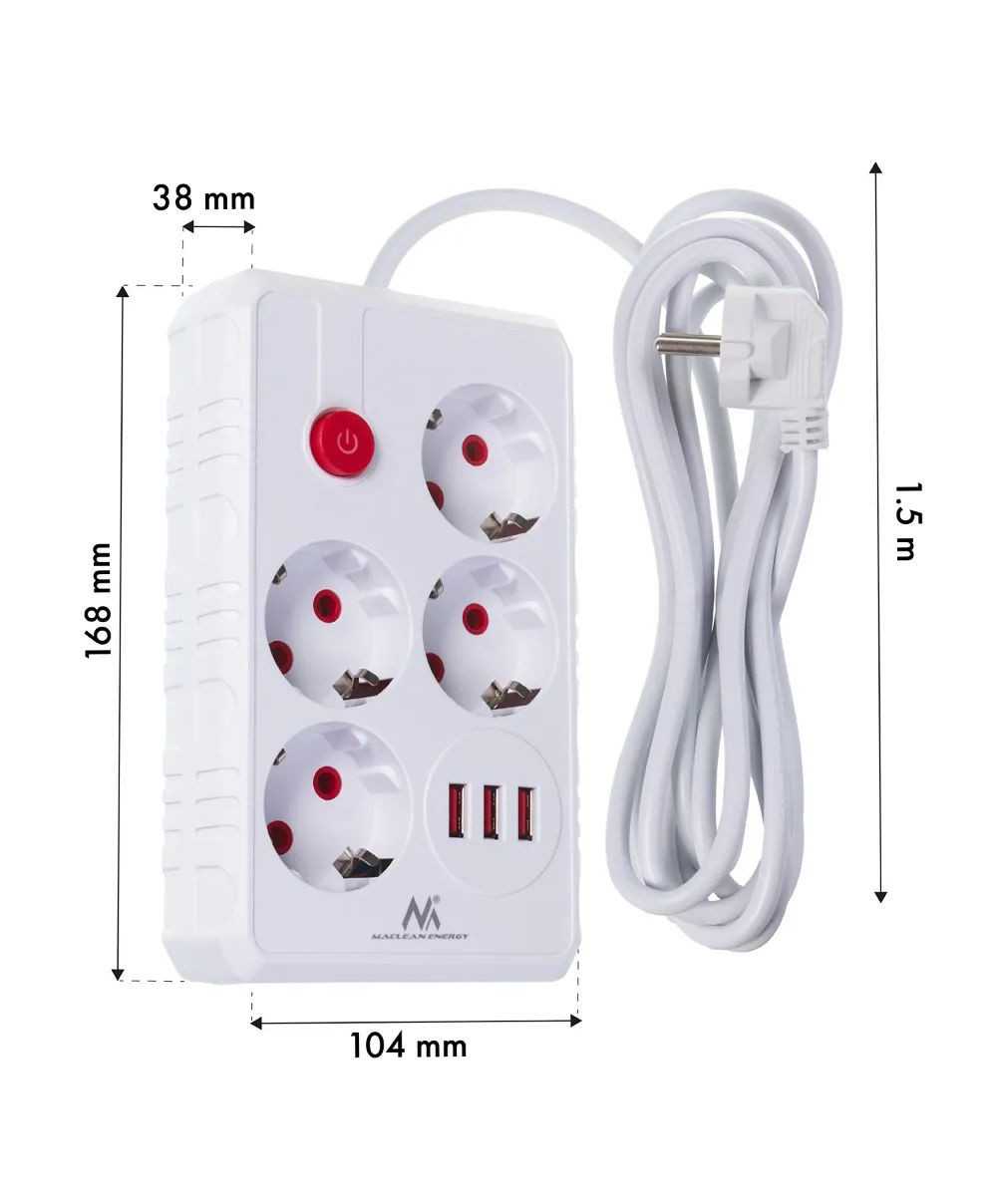 - Tehnične specifikacije: - Število vtičnic: 4 - Vrsta vtičnice: F (šuko) - Vrsta vtiča: unischuko (univerzalni) - Število USB vrat: 3 USB vrata tipa A (2,1 A, 5 V DC) - Največja obremenitev: 2500 W - Napetost: 110–240 V AC - Dolžina kabla: 1,5 m - Specifikacija kabla: 3x0,75m2, 227 IEC 53 (RVV), 300/500V - Položaj vtičnice: kot 45° - Stikalo: rdeč gumb z vijolično osvetlitvijo - Material ohišja: plastika - Dimenzije ohišja: 168 x 104 x 39 mm - Razmik med montažnimi luknjami: 128 mm - Barva: bela - Garancija 12 mesecev - Varnostna slika izdelka- Info proizvajalca / Odgovorna oseba EU - Euroelectronics.eu Sp. z o. k., Korfantego 7, 42-600, Poland, sklep@centrumelektroniki.pl