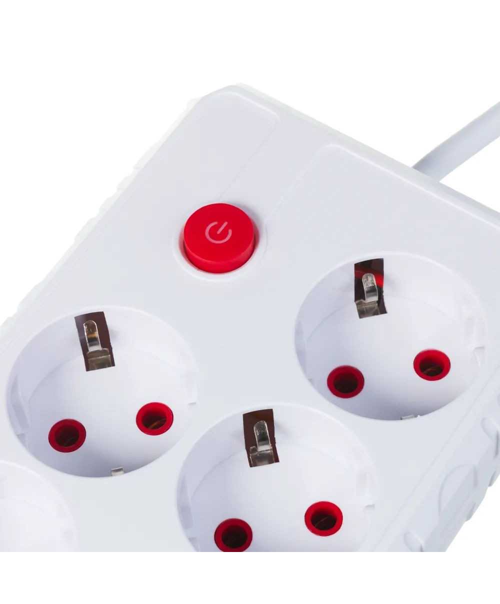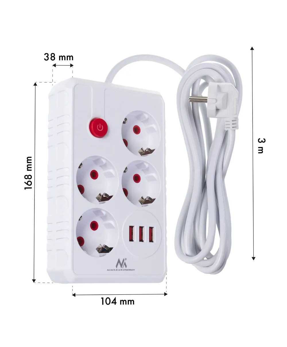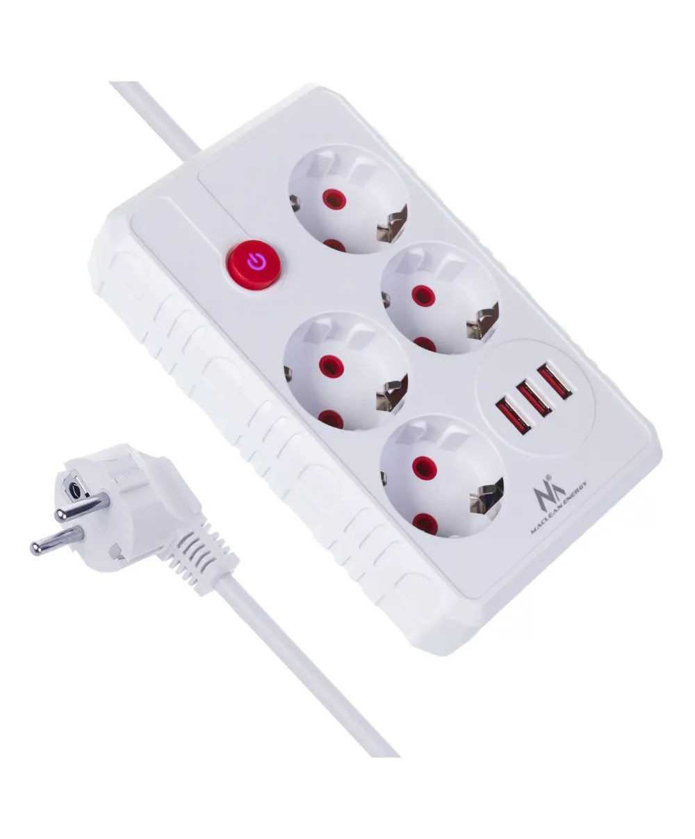 - Tehnične specifikacije: - Število vtičnic: 4 - Vrsta vtičnice: F (šuko) - Vrsta vtiča: unischuko (univerzalni) - Število USB vrat: 3 USB vrata tipa A (2,1 A, 5 V DC) - Največja obremenitev: 2500 W - Napetost: 110–240 V AC - Dolžina kabla: 3 m - Specifikacija kabla: 3x0,75m2, 227 IEC 53 (RVV), 300/500V - Položaj vtičnice: kot 45° - Stikalo: rdeč gumb z vijolično osvetlitvijo - Material ohišja: plastika - Dimenzije ohišja: 168 x 104 x 39 mm - Razmik med montažnimi luknjami: 128 mm - Barva: bela - Garancija 12 mesecev - Varnostna slika izdelka- Info proizvajalca / Odgovorna oseba EU - Euroelectronics.eu Sp. z o. k., Korfantego 7, 42-600, Poland, sklep@centrumelektroniki.pl