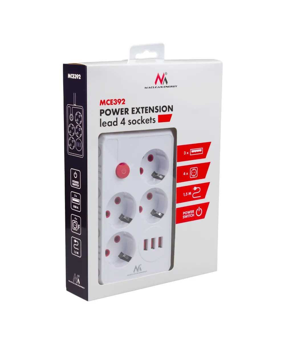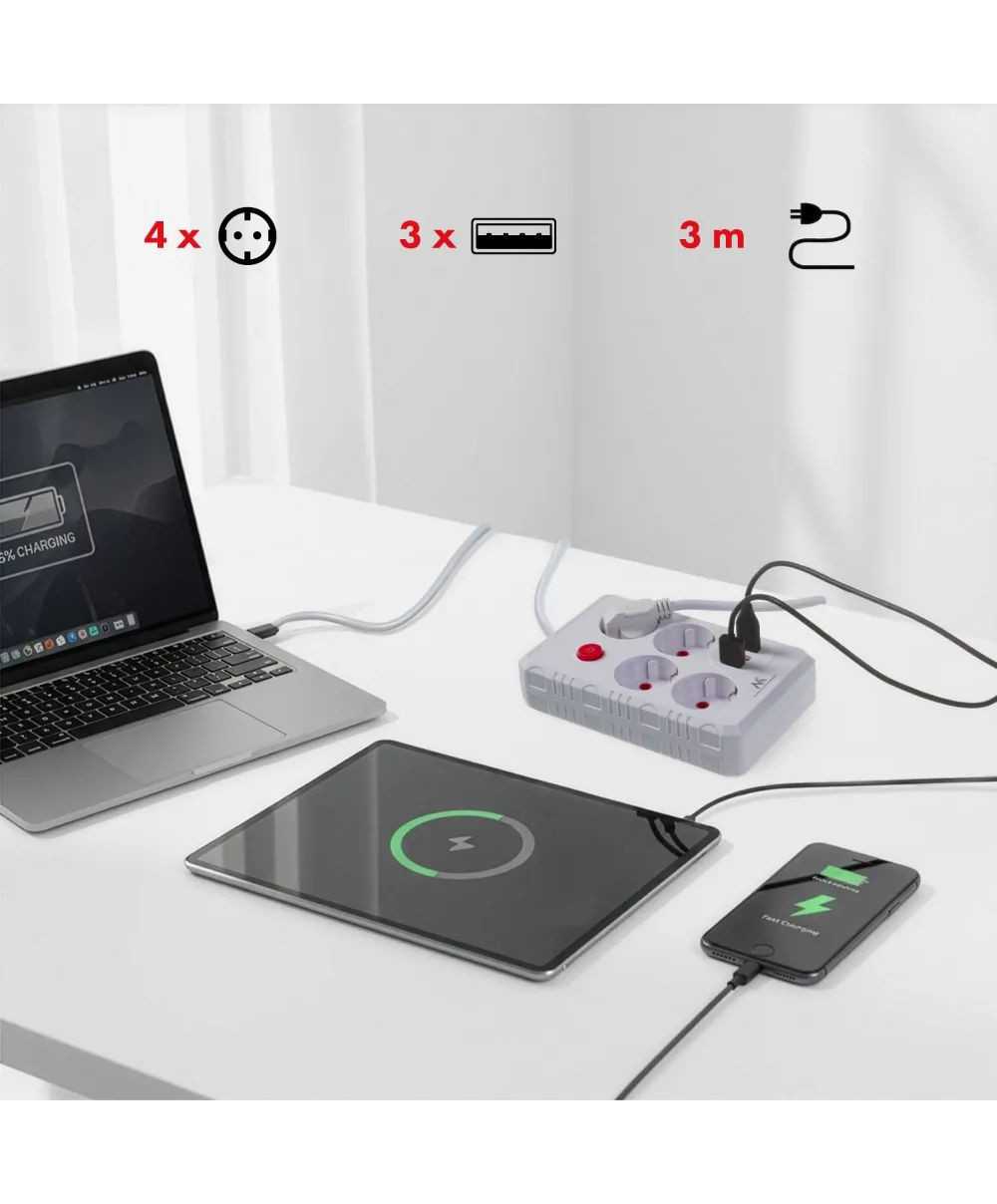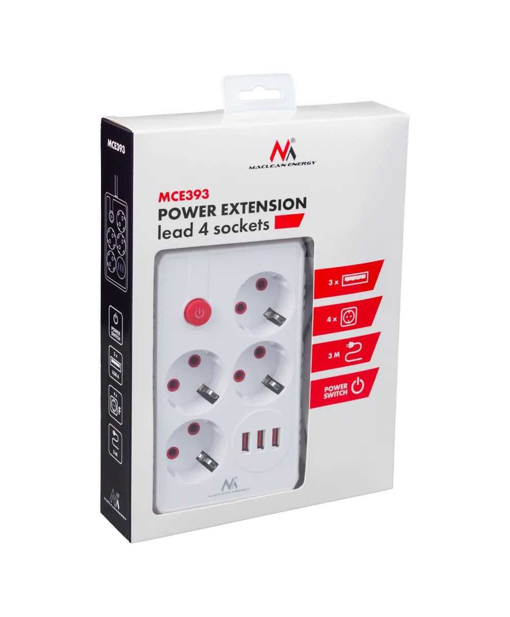 - Tehnične specifikacije: - Število vtičnic: 4 - Vrsta vtičnice: F (šuko) - Vrsta vtiča: unischuko (univerzalni) - Število USB vrat: 3 USB vrata tipa A (2,1 A, 5 V DC) - Največja obremenitev: 2500 W - Napetost: 110–240 V AC - Dolžina kabla: 3 m - Specifikacija kabla: 3x0,75m2, 227 IEC 53 (RVV), 300/500V - Položaj vtičnice: kot 45° - Stikalo: rdeč gumb z vijolično osvetlitvijo - Material ohišja: plastika - Dimenzije ohišja: 168 x 104 x 39 mm - Razmik med montažnimi luknjami: 128 mm - Barva: bela - Garancija 12 mesecev - Varnostna slika izdelka- Info proizvajalca / Odgovorna oseba EU - Euroelectronics.eu Sp. z o. k., Korfantego 7, 42-600, Poland, sklep@centrumelektroniki.pl