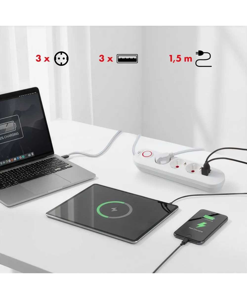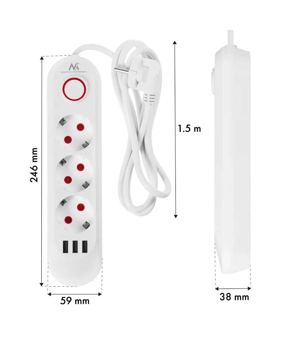 - Tehnične specifikacije: - Število vtičnic: 3 - Vrsta vtičnice: F (šuko) - Vrsta vtiča: unischuko (univerzalni) - Število USB vrat: 3 USB vrata tipa A (2,1 A, 5 V DC) - Največja obremenitev: 2500 W - Napetost: 110–240 V AC - Dolžina kabla: 1,5 m - Specifikacija kabla: 3x0,75m2, 227 IEC 53 (RVV), 300/500V - Položaj vtičnice: kot 45° - Stikalo: da - Osvetlitev ozadja: Vrata USB so osvetljena, ko trak deluje - Barva osvetlitve ozadja: modra - Material ohišja: plastika - Dimenzije ohišja: 246 x 59 x 38 mm - Razmik med montažnimi luknjami: 184 mm - Barva: bela - Garancija 12 mesecev - Varnostna slika izdelka- Info proizvajalca / Odgovorna oseba EU - Euroelectronics.eu Sp. z o. k., Korfantego 7, 42-600, Poland, sklep@centrumelektroniki.pl
