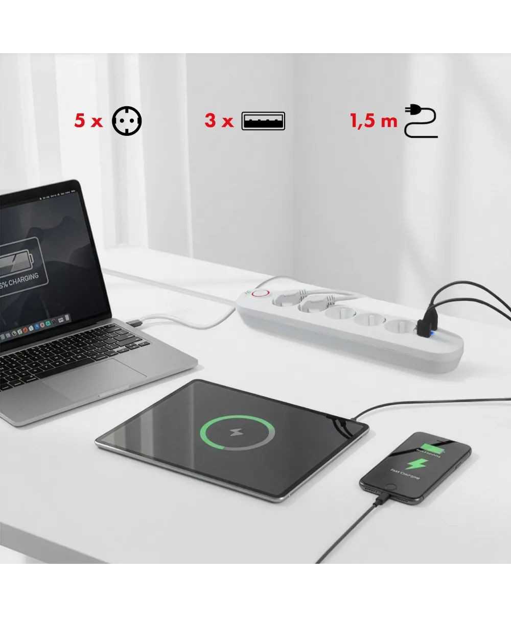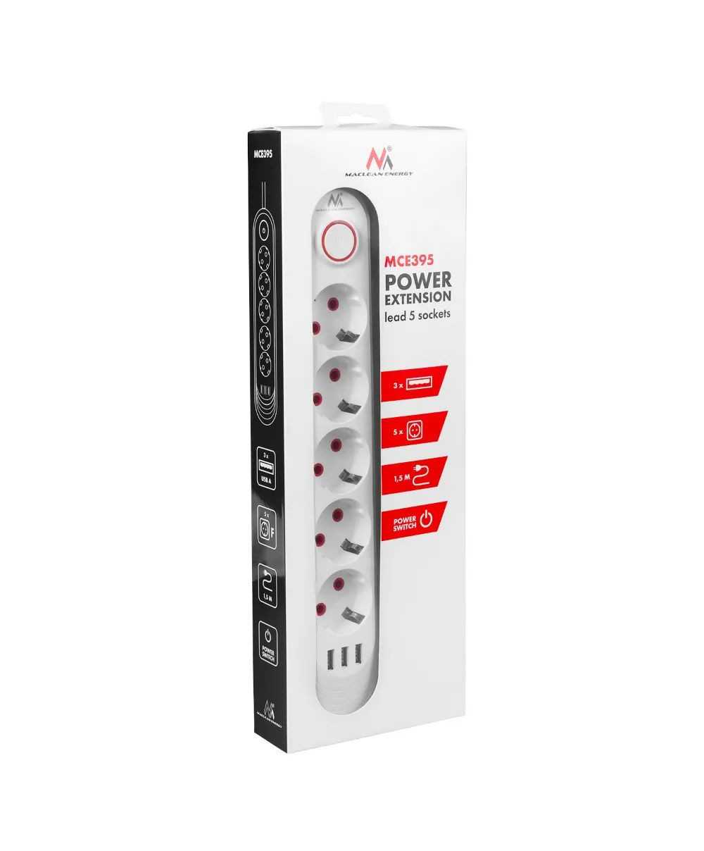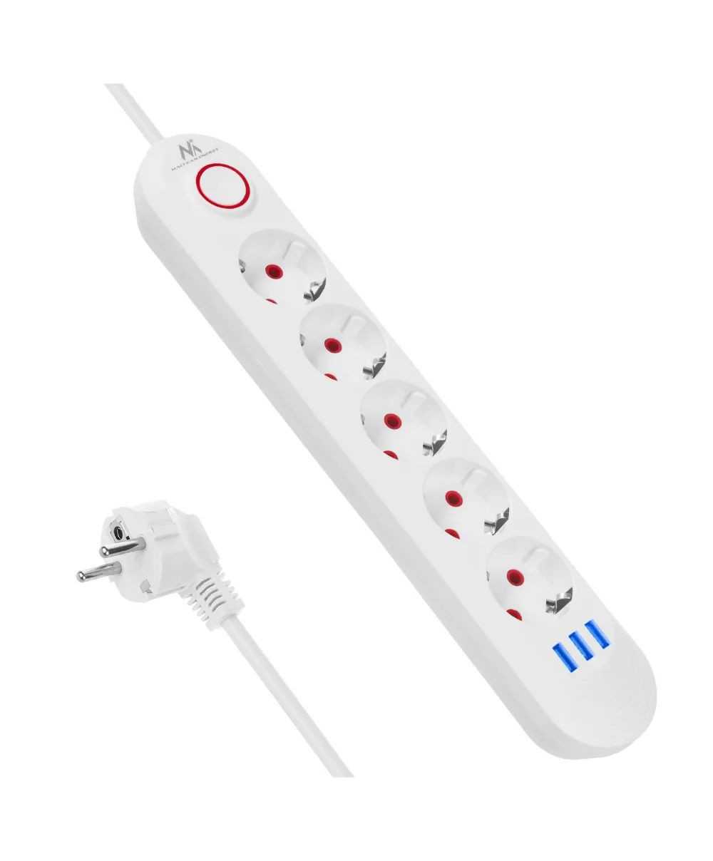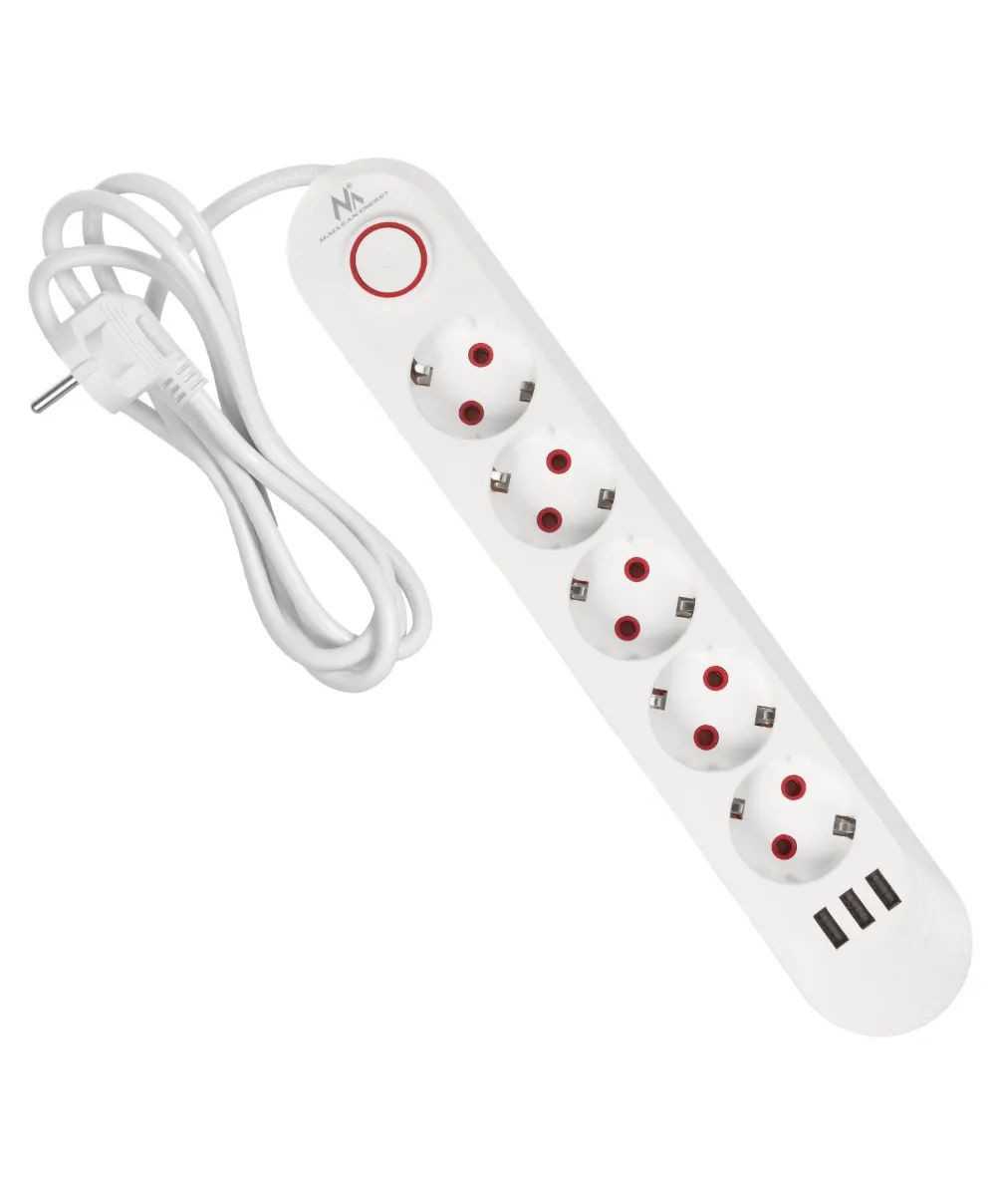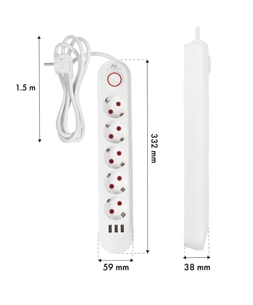 - Tehnične specifikacije: - Število vtičnic: 5 - Vrsta vtičnice: F (šuko) - Vrsta vtiča: unischuko (univerzalni) - Število USB vrat: 3 USB vrata tipa A (2,1 A, 5 V DC) - Največja obremenitev: 2500 W - Napetost: 110–240 V AC - Dolžina kabla: 1,5 m - Specifikacija kabla: 3x0,75m2, 227 IEC 53 (RVV), 300/500V - Položaj vtičnice: kot 45° - Stikalo: da - Osvetlitev ozadja: Vrata USB so osvetljena, ko trak deluje - Barva osvetlitve ozadja: modra - Material ohišja: plastika - Dimenzije ohišja: 332 x 59 x 38 mm - Razmik med montažnimi luknjami: 268 mm - Barva: bela - Garancija 12 mesecev - Varnostna slika izdelka- Info proizvajalca / Odgovorna oseba EU - Euroelectronics.eu Sp. z o. k., Korfantego 7, 42-600, Poland, sklep@centrumelektroniki.pl