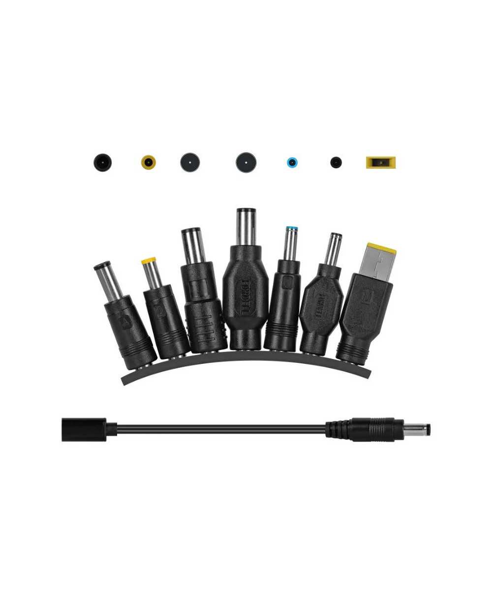 - V kompletu je priloženih kar 7 zamenljivih priključkov, združljivih s priljubljenimi znamkami, kot so Dell, HP, Lenovo, Sony in Samsung. Tako zadošča en sam napajalnik za več prenosnikov doma ali v podjetju. To je popolna rešitev za vse, ki uporabljajo različne naprave ali pa iščejo rezervni univerzalni napajalnik.