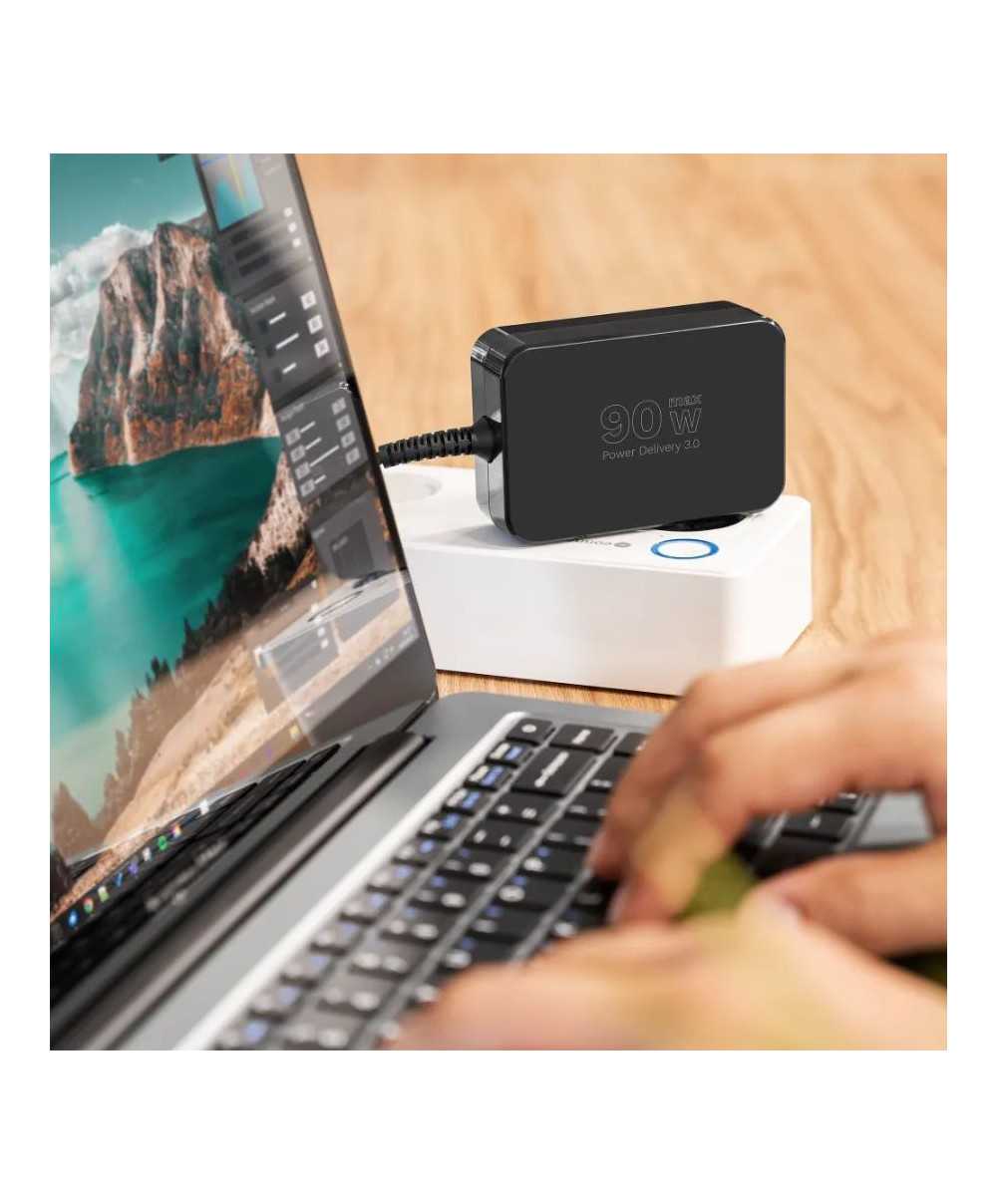 - Večja moč pomeni hitrejše polnjenje! Napajalnik s 90 W zagotavlja učinkovito in stabilno napajanje prenosnikov in mobilnih naprav. Podpira Power Delivery 3.0 z napetostmi od 5 V do 20 V ter samodejno prilagaja parametre posamezni napravi. Tako tudi zahtevnejši prenosniki v kratkem času znova dobijo dovolj energije.