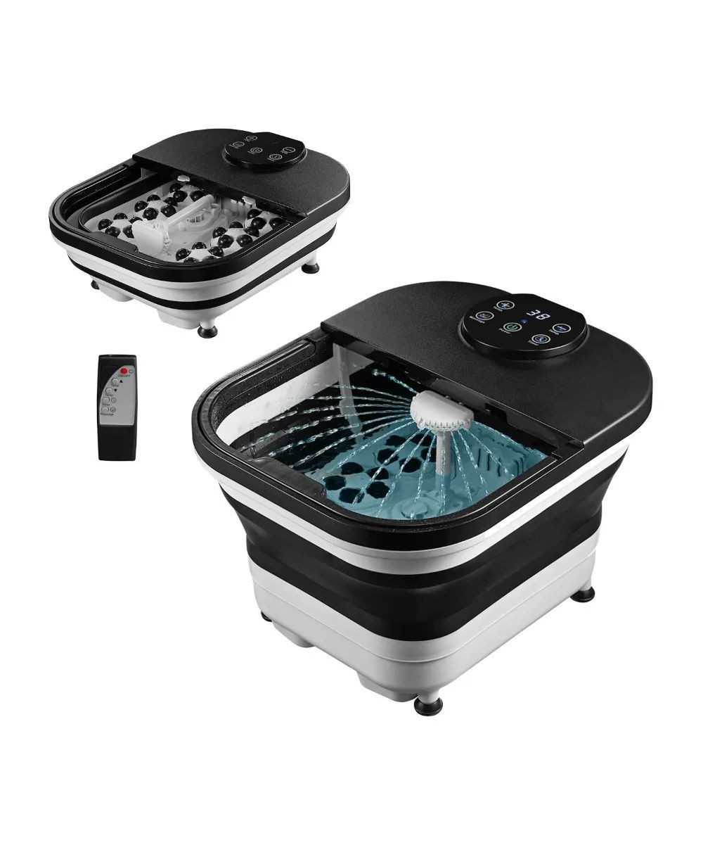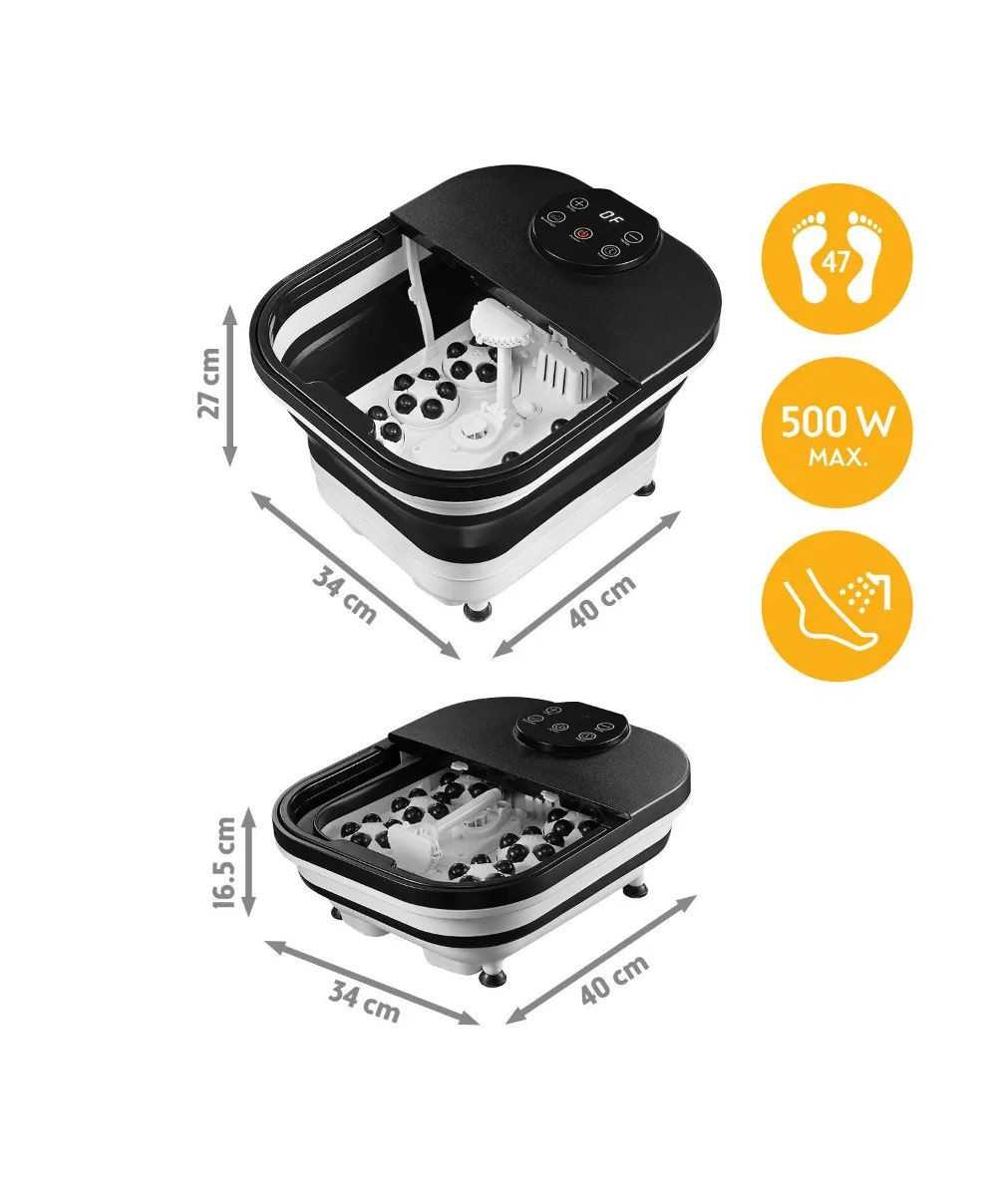 - Masažer za stopala, zložljiva masažna kad za stopala z grelcem, 6 masažnih valjev, 500 W - INTENZIVNA MASAŽA : 6 motoriziranih masažnih valjev zagotavlja pomirjujočo masažo stopal, avtomatska prha za stopala pa odlično dopolni spa izkušnjo. - INDIVIDUALNA TEMPERATURA: Temperaturo vode je mogoče digitalno nastaviti v območju od 35 do 48 °C v korakih po 1 °C in je prikazana na LED-zaslonu. - ENOSTAVNO UPRAVLJANJE: Z gumbi ali priročno z daljinskim upravljalnikom. Vgrajen časovnik zagotavlja tudi varen in samodejni izklop. - PRAKTIČNA OBLIKA: Zahvaljujoč ročaju za nošenje, zložljivemu ohišju in dvema robustnima zaklepnima palicama je naprava zelo mobilna in prihrani prostor pri shranjevanju. - MAKSIMALNO UDOBJE: Z višino korita 17 cm in prostorom za čevlje do velikosti 47 (EU) ponuja kopel za noge veliko prostora za sproščujoče aplikacije. - Tehnični podatki: - Moč: 500 W - Prostornina: 9,8 l - Globina korita: 17 cm - Višina gladine vode: 9 cm do oznake MAX - Velikost stopal: do 47 (EU), 30 cm - Masažni valji: 6 - Funkcija ogrevanja: DA - Nadzor temperature: DA (digitalni) - Temperaturno območje: 35–48 °C - Specifikacije temperaturnega območja: koraki po 1 °C. Upravljanje/krmiljenje: digitalno. - Daljinski upravljalnik: DA - LCD Zaslon: DA - Programi: 2 nastavitvi - Podrobnosti programa: 1) Izbira temperature 2) Motorizacija masažnih valjev in prhe za noge - Časovnik: DA - Območje časovnika: 0 - 60 min - Podrobnosti območja časovnika: v 10-minutnih korakih - Zložljiv mehanizem za zaklepanje: DA - Motorizirani masažni valjčki: DA - Zaščitni pokrov: DA - Ročaj za nošenje: DA - Značilnosti: digitalni nadzor, 6 motoriziranih masažnih valjev, prha za noge, daljinski upravljalnik - Značilnosti: Motorizirani masažni valjčki + prha za noge - Raven hrupa: 55 dB(A) - Dolžina kabla: 145 cm - Teža: 3 kg - Garancija 12 mesecev - Varnostna slika izdelka:- Info proizvajalca / Odgovorna oseba EU - TIMETRON GES.M.B.H.; Raimundgasse 1/8, A-1020; AT;info@timetron.si
