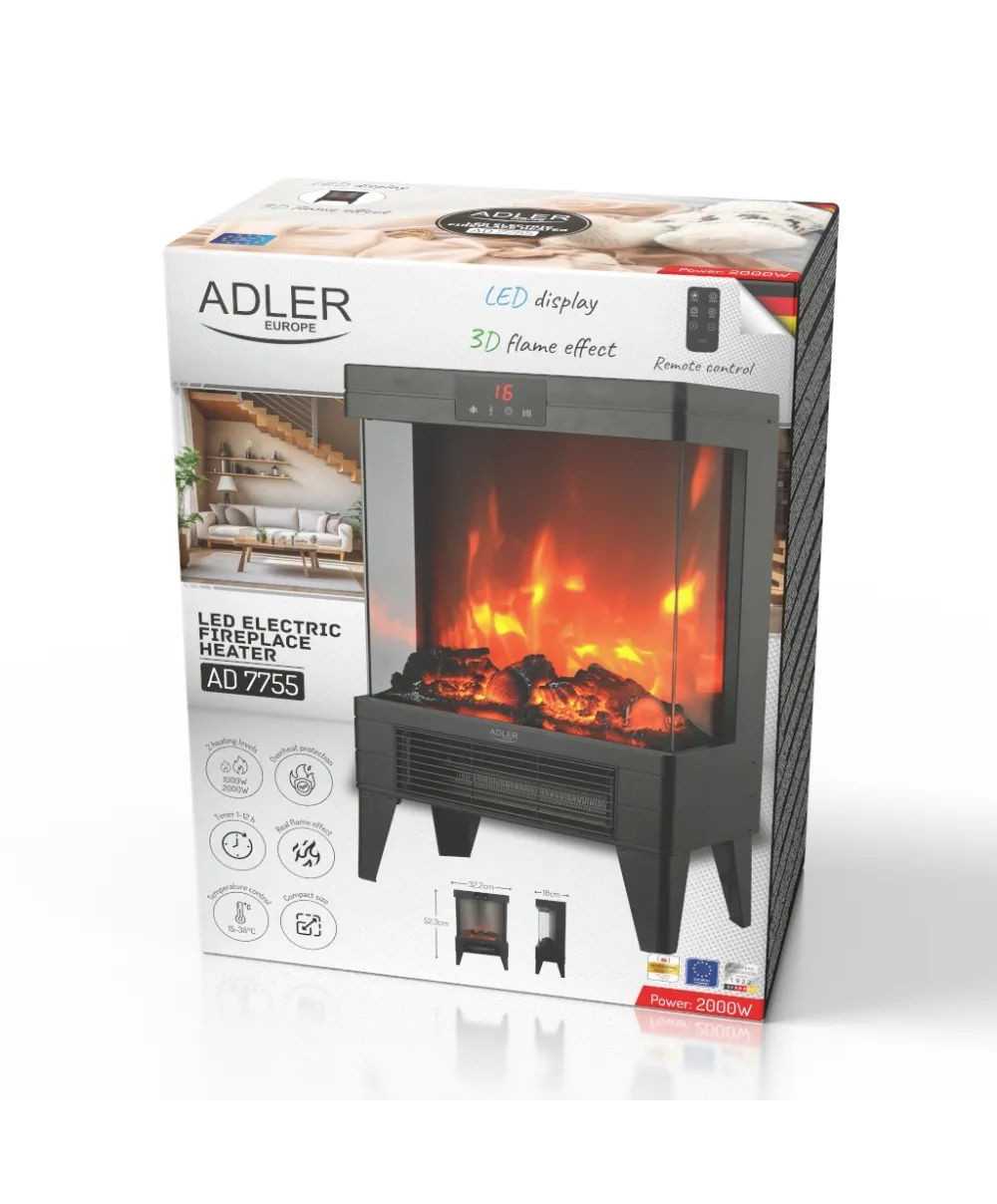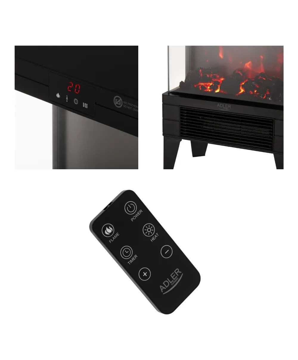 - Tehnični podatki: - Moč 2000 W - Dve moči gretja: 1000 W, 2000 W - LED zaslon na dotik - Dgrajen termostat - Dermostat samodejno prilagodi stopnjo ogrevalne moči nastavljeni temperaturi - Daljinski upravljalnik ( baterije niso priložene ) - Časovnik 1-12 ur - Nadzor temperature 15–38 °C - 3D učinek pravega plamena - Stikalo za plamen - lahko se uporablja neodvisno od funkcije ogrevanja - Prozorno, kaljeno steklo - Zaščita pred pregrevanjem - Prenosna zasnova - Sodoben dizajn - Napajanje: 220–240 V ~ 50–60 Hz - Napajalni kabel 1,4 m - Material ohišja: kovina, ABS, steklo - Vrsta vtiča: E/F - Teža naprave: 4,83 kg - Barva: črna - Garancija 12 mesecev - Ta izdelek ni primeren za primarno ogrevanje. - Ta izdelek je primeren le za uporabo v dobro izoliranih prostorih ali za priložnostno uporabo. - Varnostna slika izdelka- Info proizvajalca / Odgovorna oseba EU - ADLER Sp. z.o.o., Ordona 2A Street, 01-237 Warsaw, Poland, gpsr@adlereurope.eu